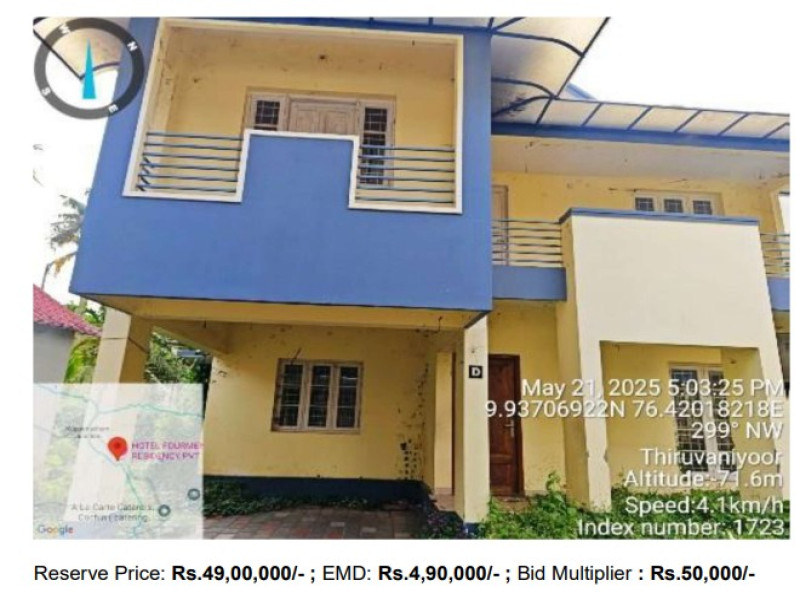 All that part and parcel of Residential Land admeasuring 2.20 Ares in Re Sy 103/7/2 (Old Sy No 88/4) on Block No.41of Thiruvaniyoor Village, Kunnathunadu Taluk, Ernakulam together with residential building villa No. V (Old No.1) Door No: XI/537D, Having an area of 1683.19 Sq.Ft. in Thiruvaniyoor – Vennikulam Road standing in the name of Mr Jibi Abraham by virtue of Sale Deed 1405/16 dated 19.03.2016 of Puthencruz SRO with boundaries as North: Villa No.4,South: Canal, East: Internal Road, West :Private Road.
