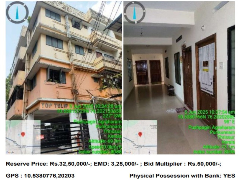 Land at Sy No. 1709/1 part and 1709/2 part to the extend of 1/42 undivided and inseparable share of 32.98 Cents and Flat Type B4, First Floor, Top Tulip of Thrissur Village, Agrahara Road, Punkunnam, Thrissur with boundaries as North: Land of Sivaraju & land of Sreekanth, South : Land of Sitaram Mills, East : Land of Sitaram Mills, West : Land of Raghavendran bhajana madam.